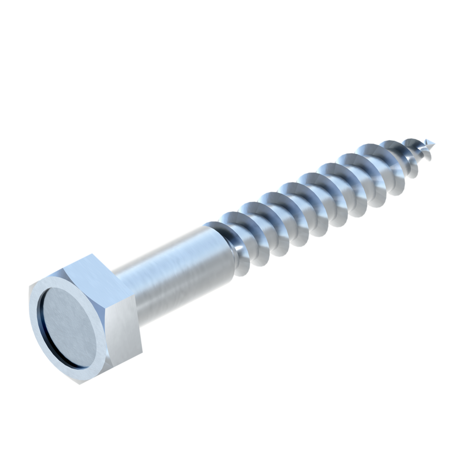 En kraftig træskrue med sekskanthoved, udført i el-galvaniseret stål.